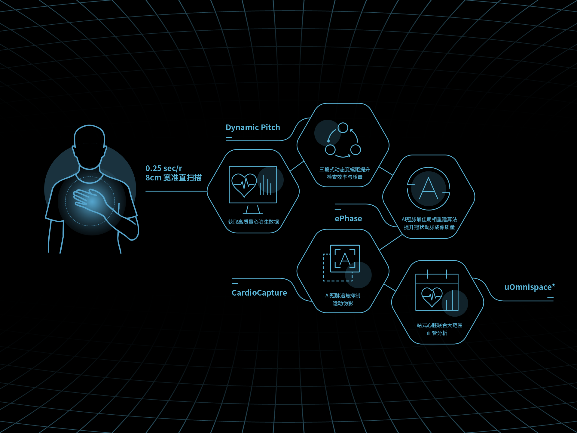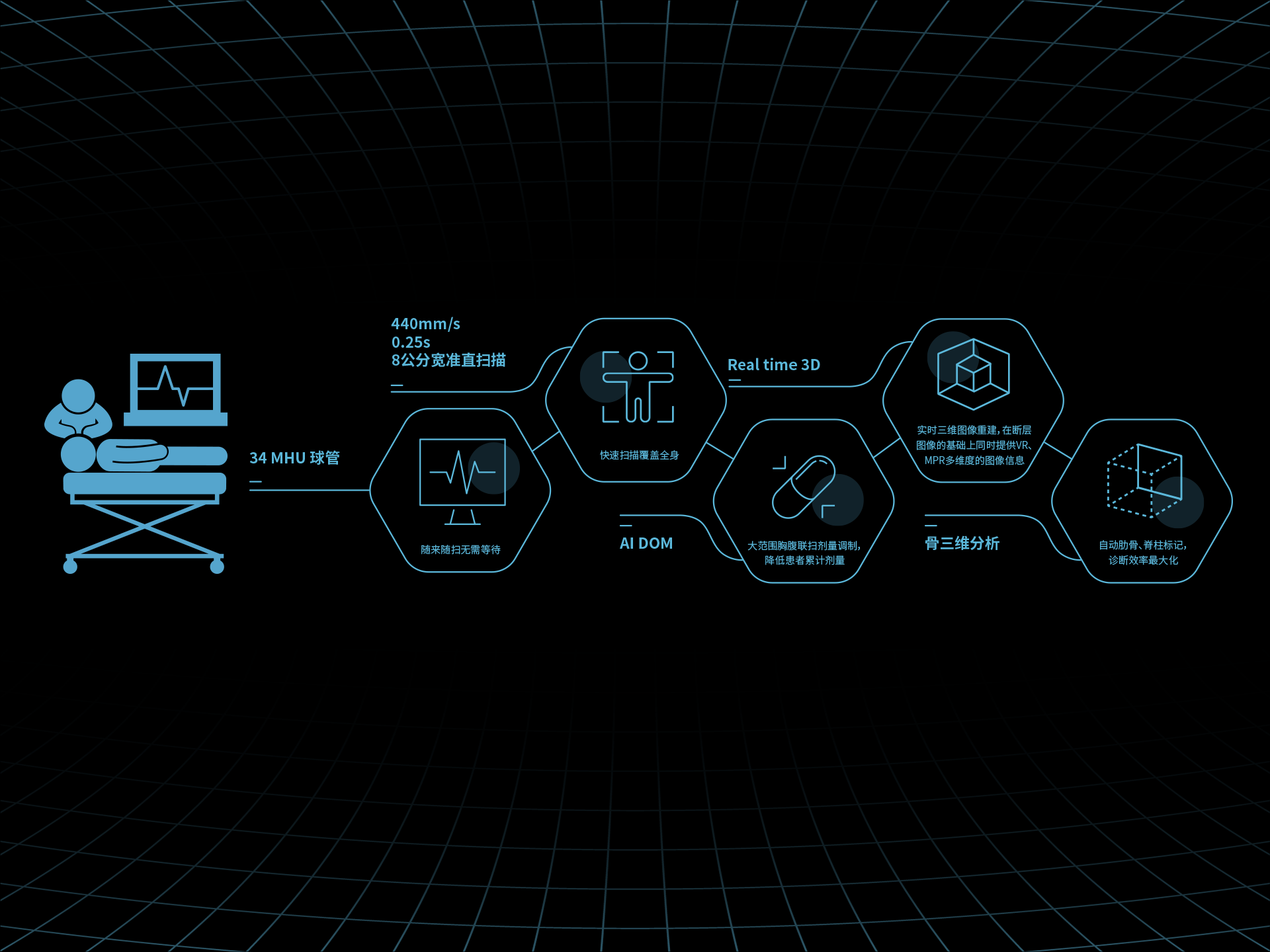 uCT 868 将人工智能深度融入 CT 成像的全链路流程,从采集、重建到后处理分析,实现智能技术与临床工作的自然协同。无需复杂操作,无感式介入,让AI 成为工作流程中默认的一环。从探测器的每一次感知,到影像重建的每一帧演算,再到临床交互的每一步路径,智能决策与精密硬件协同一体,大幅提升图像质量、诊断效率与操作一致性。uCT 868,不仅帮助医生看清更多,更让“如何做到”变得不再被感知,让精准、清晰、高效成为诊疗中的标准反应——这正是 uCT 868 所赋予的“本能级”影像体验。